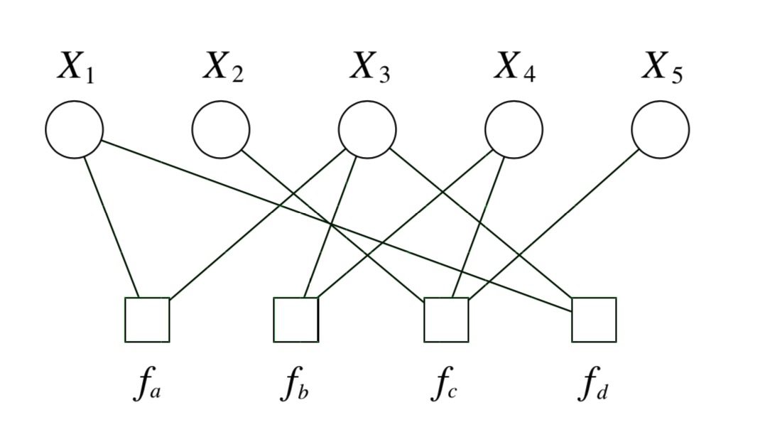 一个因子图包含一个随机变量集合 \(\mathbf{x}=\left(\mathrm{x}_{1}, \dots, \mathrm{x}_{N}\right)\) 以及 一张图 \(\mathcal{G}=(\mathcal{V}, \mathcal{E}, \mathcal{F})\) , 除了变量结点集合 \(\mathcal{V}\) 以外还含有因子结点集合 \(\mathcal{F}\) 。 此外,该图被约束为变量节点和因子节点之间的二分图,即 仅有变量结点和因子结点之间存在边 。