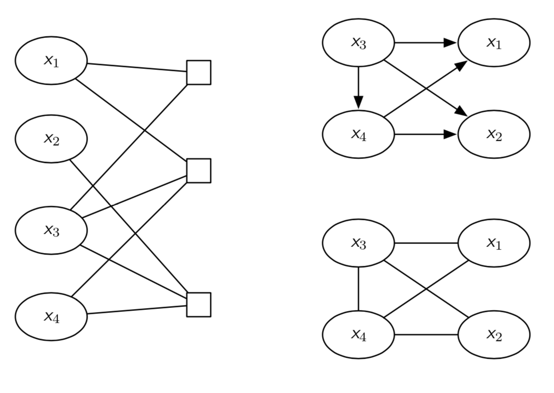 图 7.2.5 把一个因子图转换为一个有向图,然后再把有向图转换为无向图¶
